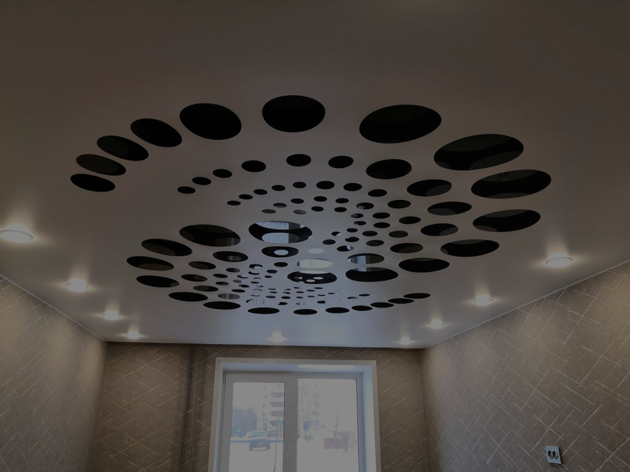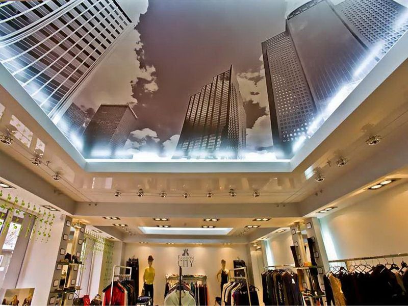Способ немного сложнее, печать делается на нескольких потолках, и работа проходит на равных уровнях. В конструкции используются каркасы, чтобы изменять форму материала, придавать ей разные формы. Используют пленку ПВХ, как в основном глянцевая.
